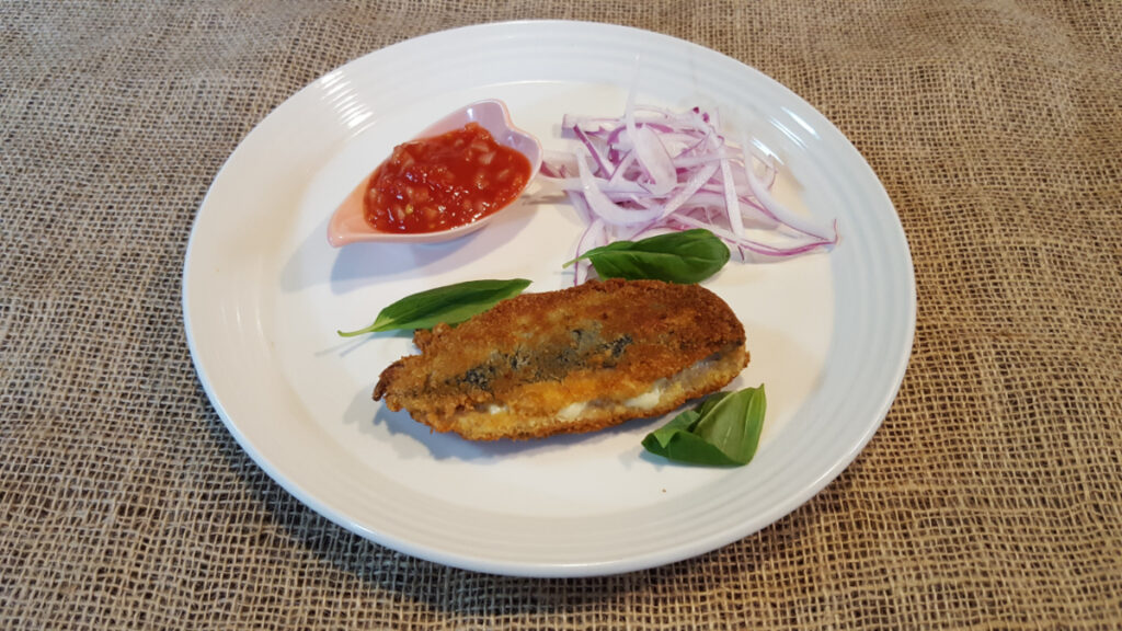 これはチーズをはさんだアジフライなんだけど、このソースも紫玉ねぎもうまいし、バジルが引き立てて最高!やっぱ揚げればそりゃうまいね!