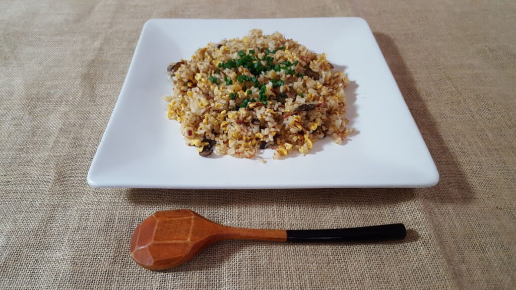 ピリ辛でボリュームぃでうんめぇぞぉ!!にんにくがまるごと入ってるから、パワーをつけるにはもってこいの飯だ!!