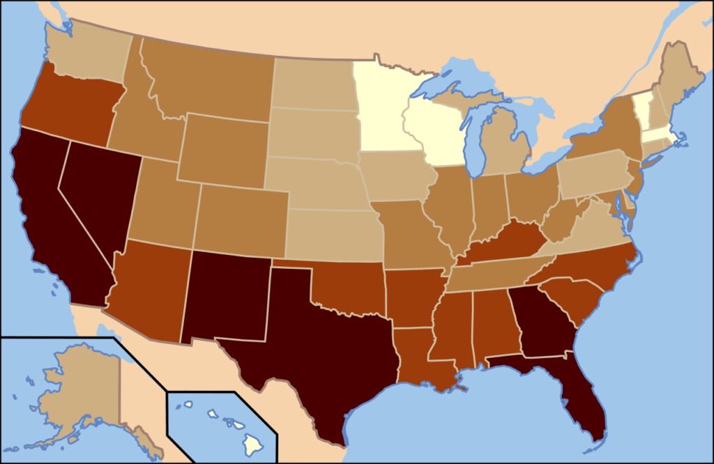 各州の無保険人口の割合(アメリカ合衆国国勢調査局、2009年)