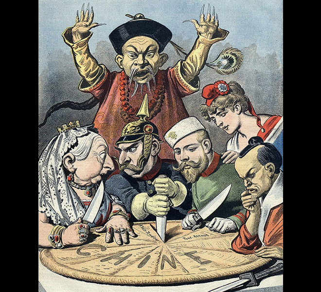 中国(CHINE)と書かれたパイが、列強により分割されている風刺画。人物は前列の左からそれぞれ、イギリス・ドイツ・ロシア・フランス・日本を表し、後列の手を挙げている人物は、清を示している。