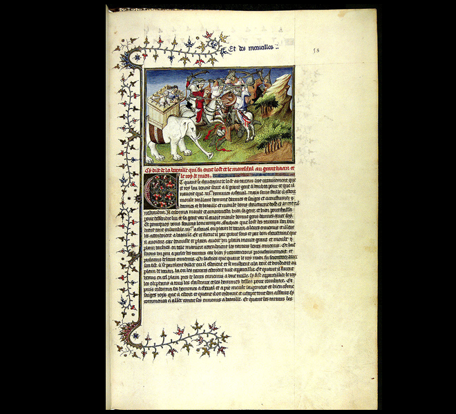 [蒙古襲来絵詞前巻、絵七。【文永の役】矢・槍・てつはうの飛び交う中、馬を射られながら蒙古軍に突撃する竹崎季長と、応戦・逃亡する蒙古兵。]