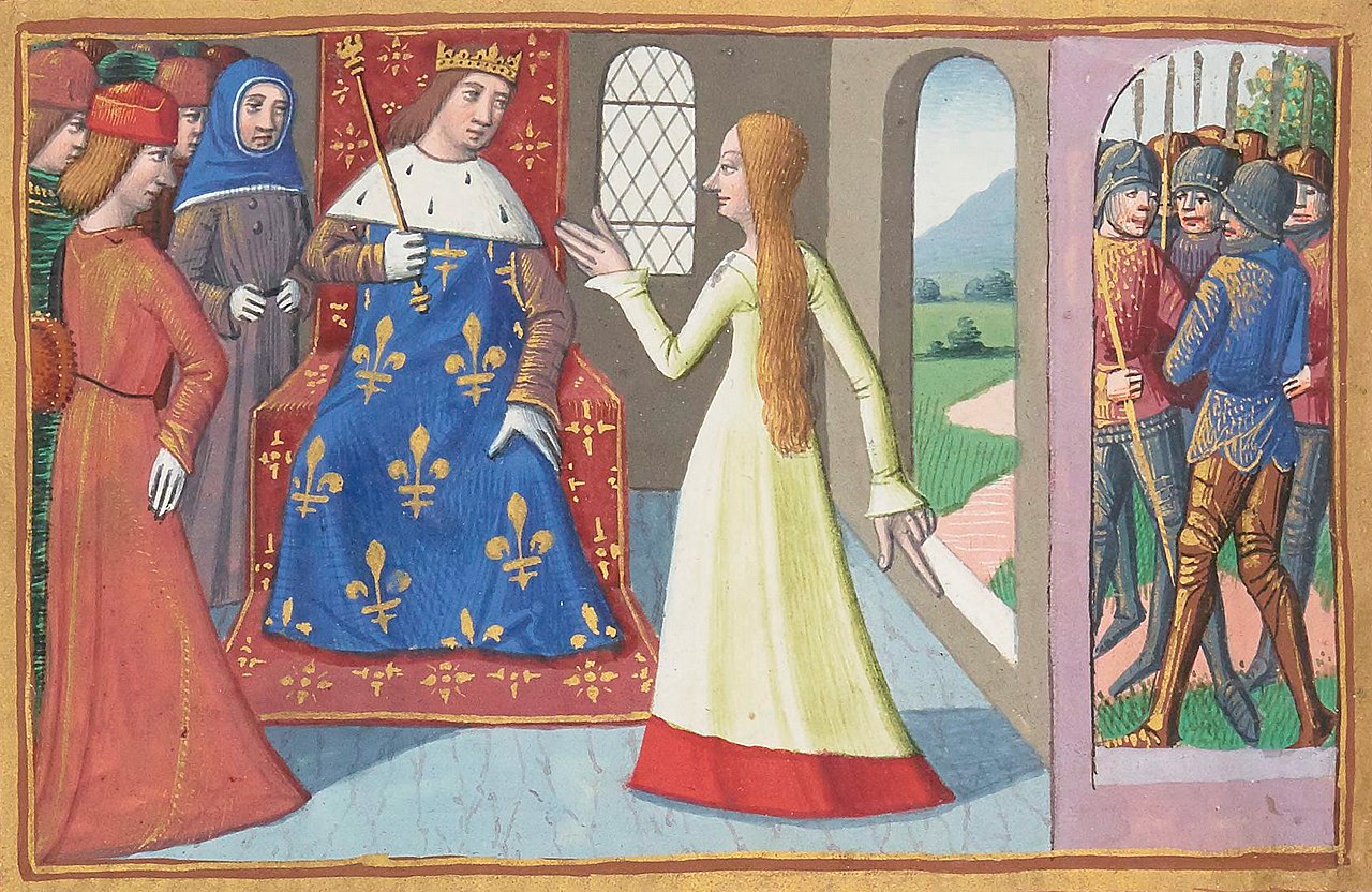 [『シャルル7世年代記』の、ジャンヌとシャルル7世が描かれたミニアチュール。]