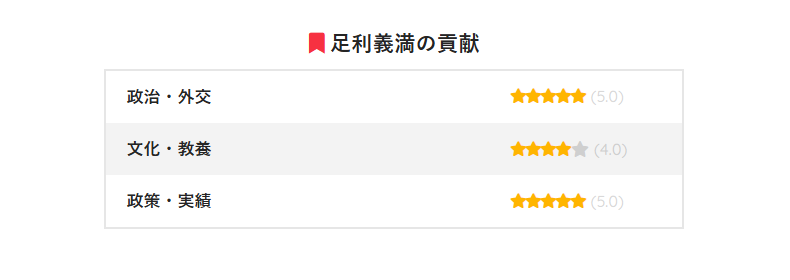 ここまで文化・教養面が高い評価をつけられる人はいないのだ。室町幕府の最盛期を築いた、彼の祖父、足利義満の場合がこうなる。